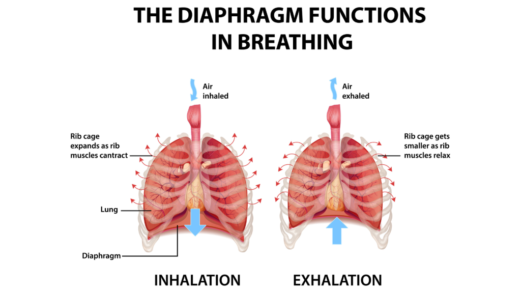 - Your diaphragm is the primary breathing muscle. When you inhale, it contracts and moves downward, expanding your chest cavity and drawing air into the lungs. For this to happen efficiently, it needs “room” — i.e. the rib cage, spine, and pelvis in relatively neutral alignment. Poor posture (slouching, forward head, rounded shoulders) restricts that space and can impair diaphragm mechanics. [The Breathing Mot, Monmouth Health and Wellness]